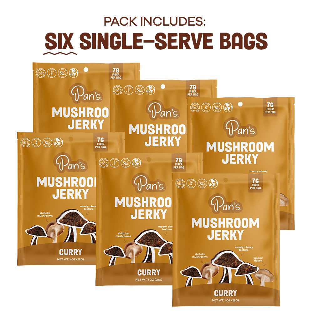 Made of shiitake mushrooms, Pan's Mushroom Jerky is plant-based, vegan, a good source of fiber, allergen friendly, Kosher, soy-free, gluten-free and made with simple ingredients.