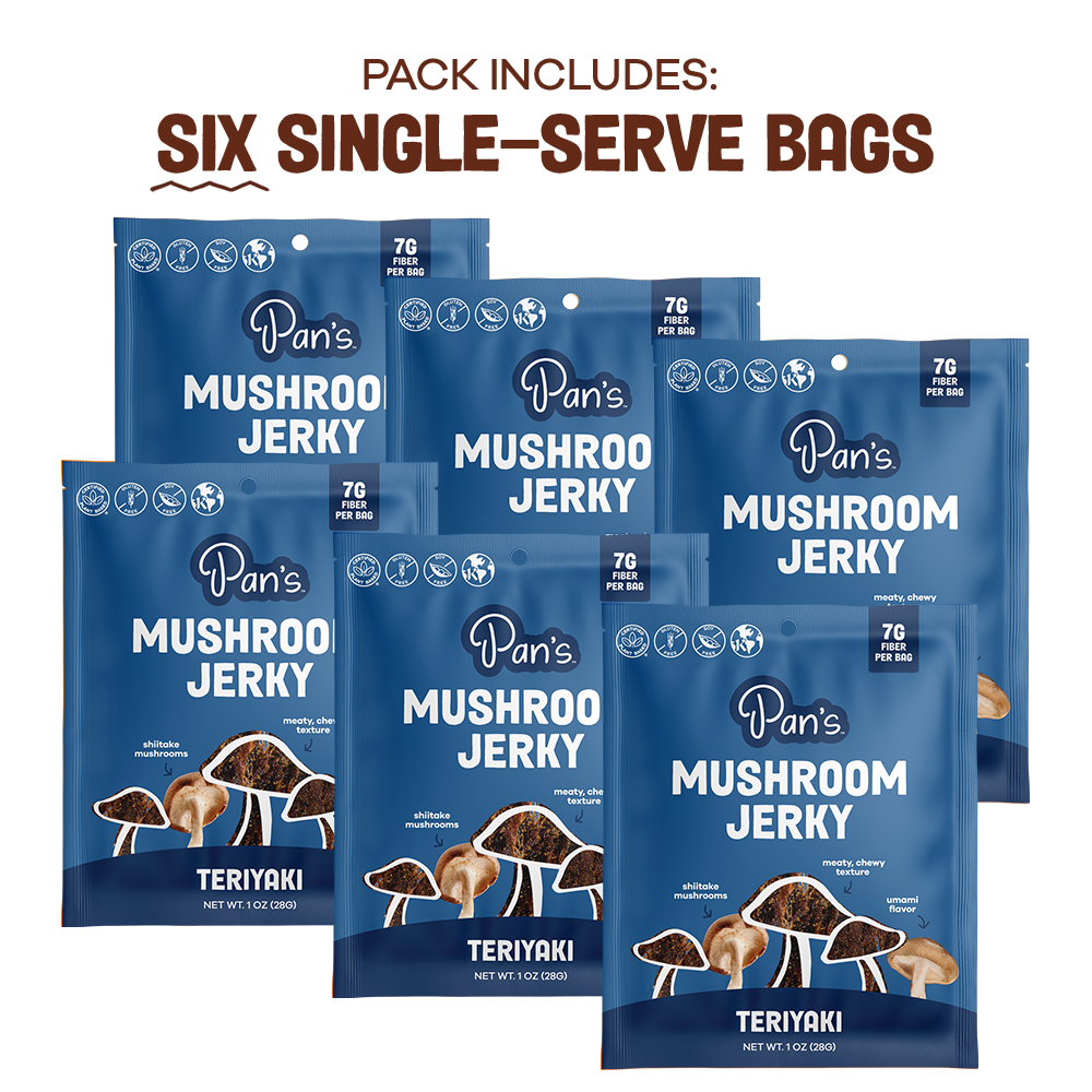 Pan's Teriyaki Mushroom Jerky has a tangy, delicious ginger and citrus flavor without soy or gluten.